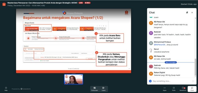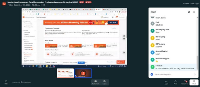 Pada 09 Disember 2022 jam 10.00 pagi hingga 12.00 tengahari telah berlangsungnya satu Program PUPUK@Shopee 2022 Campaign – Online Class (Masterclass Pemasaran: Cara Memasarkan Produk Anda dengan Strategik) di Pusat Ekonomi Digital Pokok Jawi. Program ini dijalankan bertujuan untuk menyampaikan ilmu kepada penjual bagaimana untuk mula menjual di Shopee dengan rangkuman asas perniagaan dari membuka kedai Shopee, pemasaran untuk meningkatkan lalu lintas dan memenuhi pesanan.