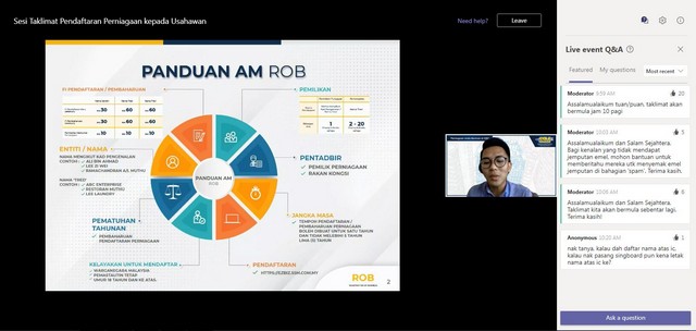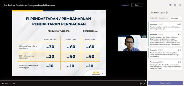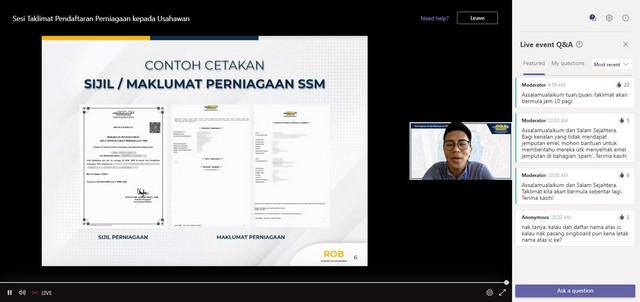 Dalam taklimat ini pihak SSM memberi panduan kepada peserta cara untuk mendaftarkan pernmiagaan mereka secara atas talian. Turut dinyatakan syarat-syarat permohonan bagi pendaftaran perniagaan dan juga kadar Fi yang dikenakan bagi pendaftaran baru, pembaharuan dan pembelian maklumat perniagaan.