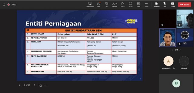 28 November 2023 | Aktiviti TerkiniPada 27 November 2023 PEDi Pokok Jawi dan komuniti setempat telah dijemput untuk menghadiri satu Taklimat Pendaftaran Perniagaan yang dianjurkan oleh Suruhanjaya Syarikat Malaysia. Taklimat tersebut telah diadakan secara maya menerusi platform Microsoft Teams (Ms Teams).