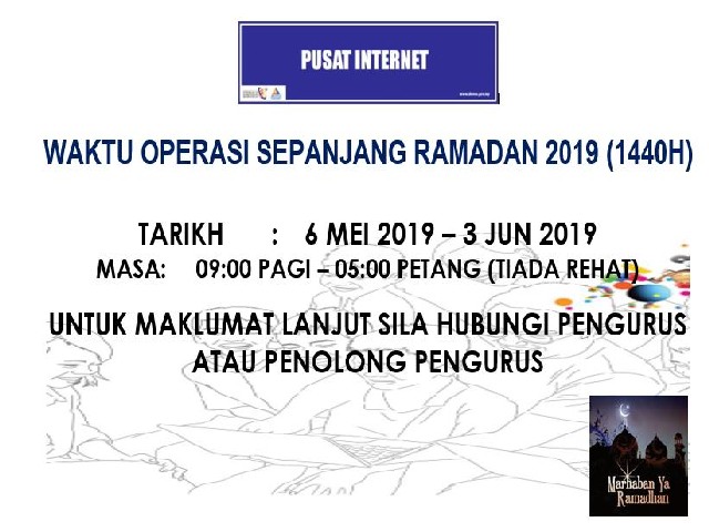 Berikut adalah Notis Waktu Operasi Pusat Internet Pokok Jawi pada bulan Ramadhan bermula 6 Mei - 3 Jun 2019